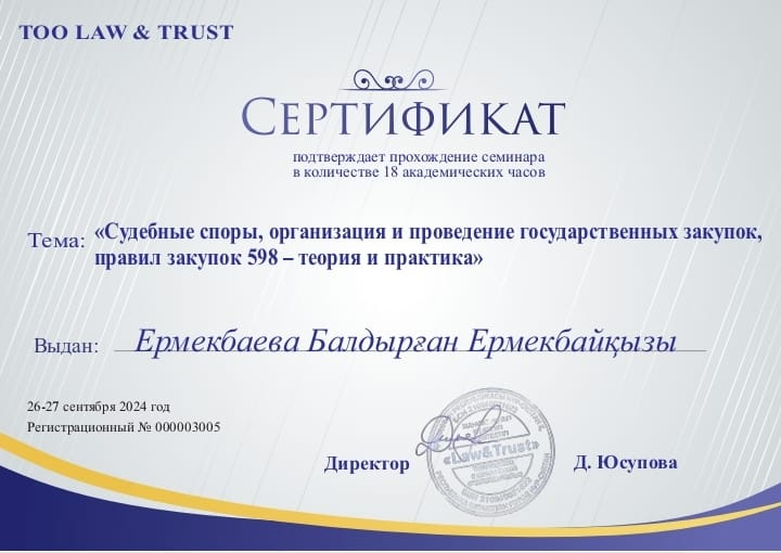 Сонымен қатар жоспарға сәйкес «Бюджет қаражатының уақытылы және толық игерілуі мен бюджеттік қаражаттарды заңсыз пайдалануға итермелейтін жағдайлар мен себептерді болдырмау мақсатында балабақша есепшісін «Мемлекеттік сатып алу заңнамасы» тақырыбында құқықтық сауаттандыру мақсатында біліктілік курсқа барып оқып келді.